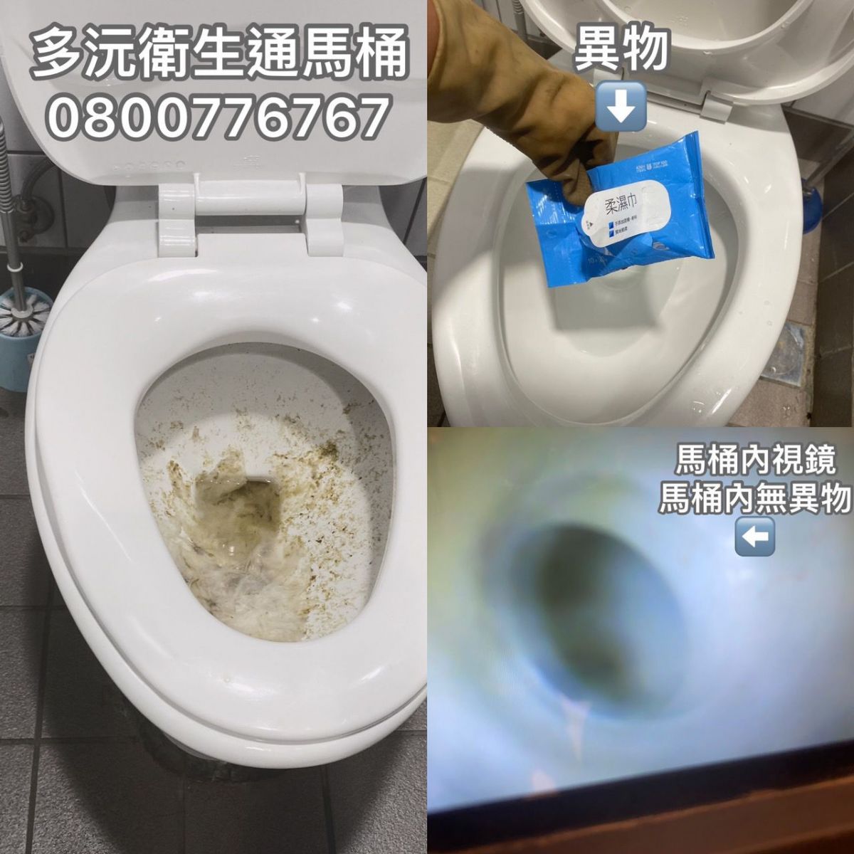 ⚠️這次的案件馬桶主要塞的原因為異物掉落,勾出濕紙巾的袋子一枚和一些濕紙巾與衛生紙,疏通完成後再用馬桶攝影觀看,確定馬桶內無異物之後多沅衛生才會安心喔!
